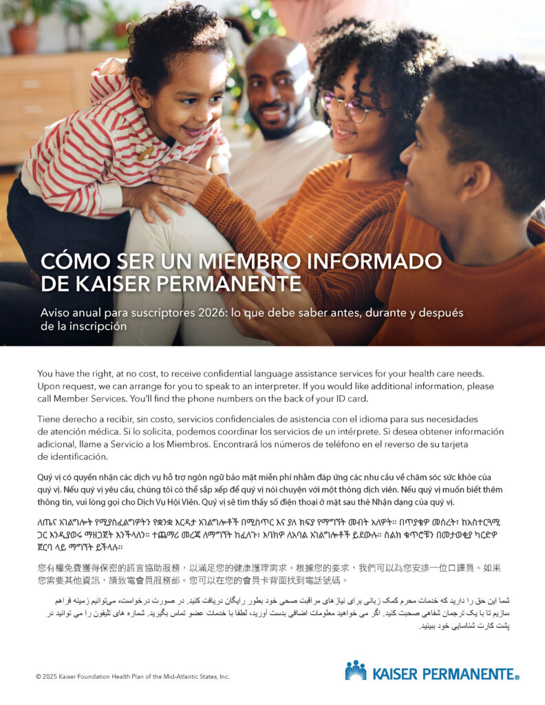 El Aviso anual para suscriptores (Annual Subscriber Notice, ASN) es una excelente manera de obtener la información más reciente sobre sus beneficios de Kaiser Permanente. Además, es un recurso importante para consultar cuando quiera obtener detalles sobre sus derechos y responsabilidades como miembro, nuestras prácticas de privacidad y mucho más. Mantenerse informado sobre estos asuntos puede ayudarle a aprovechar al máximo su atención médica.